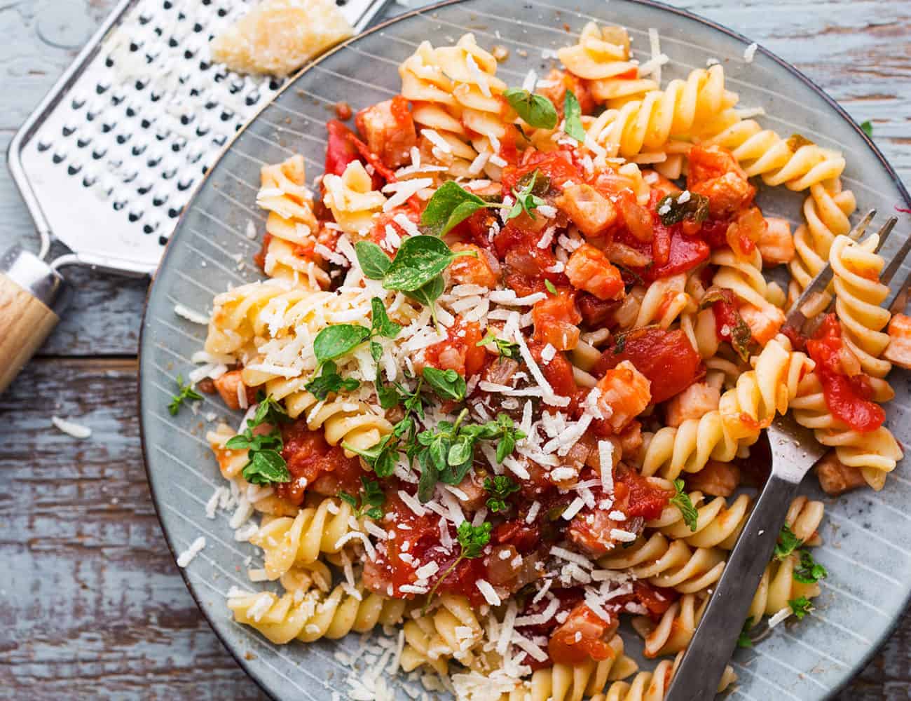 Fusilli abgießen, tropfnass mit der Tomatensoße vermengen und ca. 1 Minute auf dem Herd ziehen lassen. Pecorino reiben und mit restlichem Oregano über die Pasta streuen.