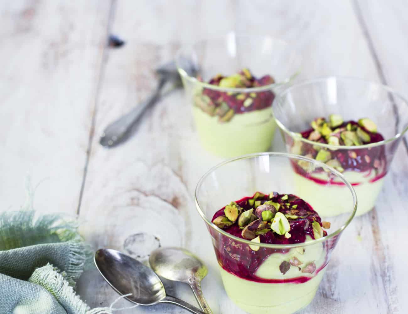 Avocadocreme auf 4 Gläser verteilen und Himbeersoße daraufgeben. Pistazien grob hacken und auf dem Dessert verteilen. |