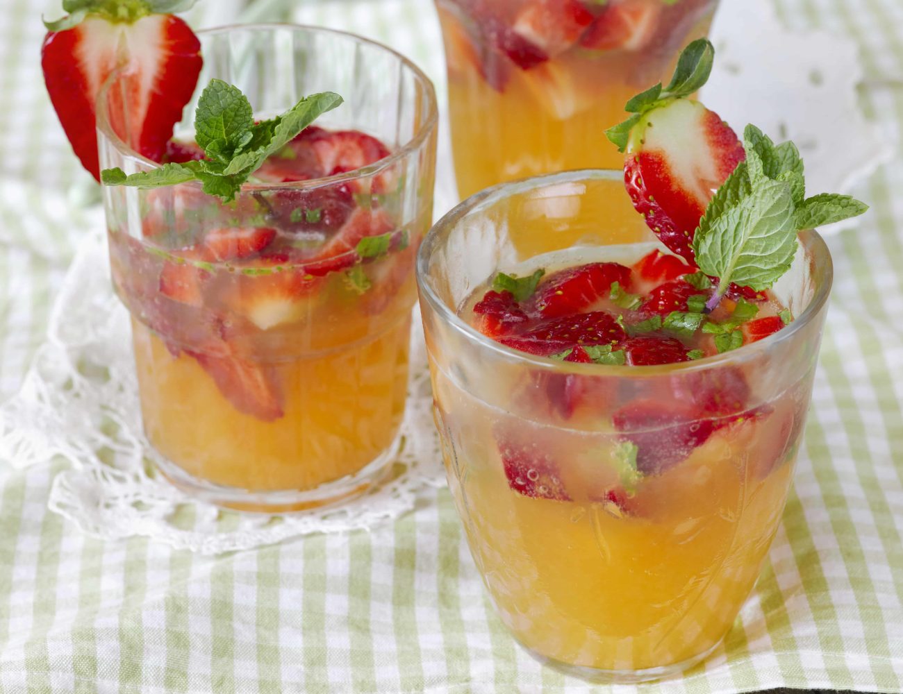 Erdbeeren putzen und in Stücke schneiden. In eine große Schüssel geben und mit Apfelsaft aufgießen. Orangen- und Zitronensaft zugeben und verrühren. Abgedeckt ca. 1 Stunde kalt stellen. |