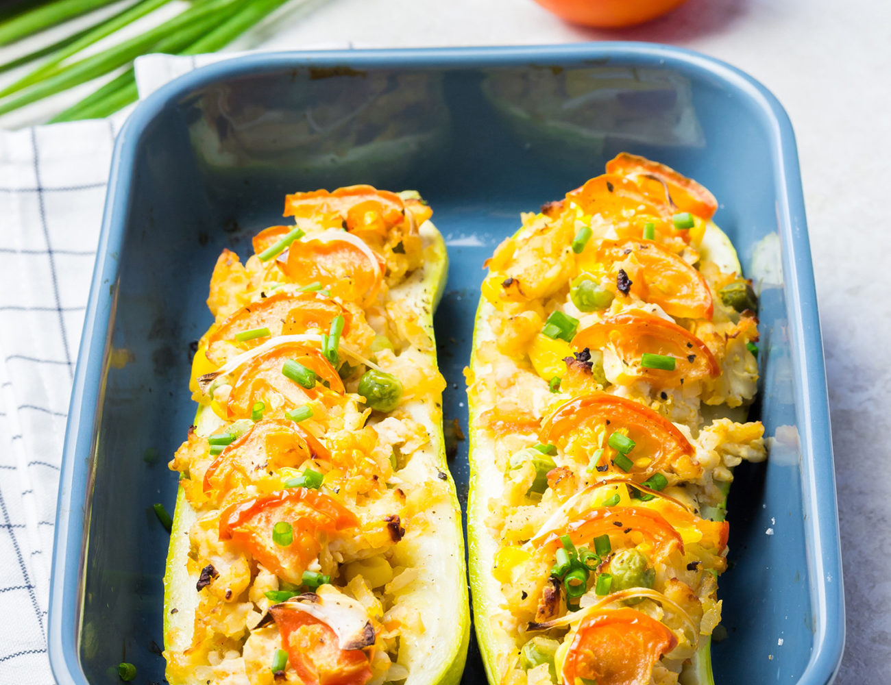 Gefüllte Zucchini? Und dann auch noch Low Carb? Nehm ich! Da brauche ich gar nicht lange überlegen. Wieso auch? Zucchini ist eins meiner liebsten Gemüse. Ich denke da an Zucchini-Lasagne – übrigens auch Low Carb. Zucchini-Puffer, Zucchinipüree, Zucchini-Frittata … du merkst schon, ich könnte immer so weiter machen. Aber diese gefüllten Schiffchen haben es mir ganz besonders angetan. Die Füllung: eine Kombination aus Frischkäse, Frühlingszwiebeln, Tomaten und ein paar Erbsen. Ja, ich weiß. Erbsen zählen zum „bösen Gemüse“. Also zu jenem, dass einen höheren Zuckergehalt hat. Aber es heißt ja schließlich Low Carb und nicht „No Carb“. Deswegen dürfen die grünen Kugeln mit in die Füllung hüpfen. Wer mag, kann sie aber natürlich auch weglassen.