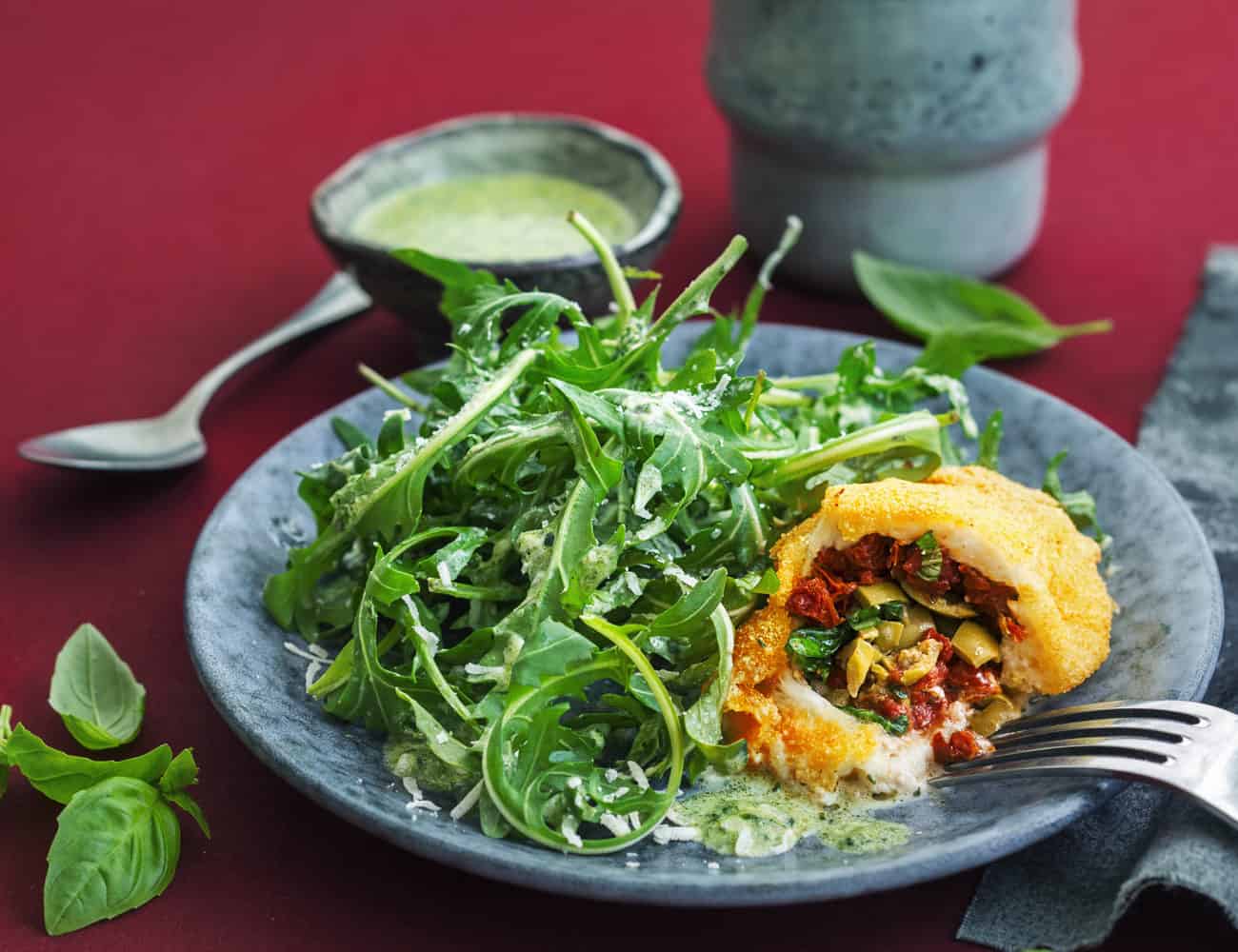 Gefüllte Zucchini ok. Gefülltes Hähnchen – ja. Aber gefüllter Mozzarella? Habe ich bis letzte Woche noch nie gesehen, geschweige denn gegessen. Aber ich sage dir, die Kugeln haben es in sich. Und das im wahrsten Sinne des Wortes. Was sich in ihnen versteckt? Eine würzige Füllung aus Oliven, Tomaten und Basilikum. Gebratene Pilze und Zwiebeln stelle ich mir aber auch ziemlich lecker vor. Zum Füllen das obere Drittel des Mozzarellas abschneiden und die Kugel vorsichtig etwas aushöhlen. Füllung hineingeben, Deckel aufsetzen und das Ganze panieren – damit’s auch schön knusprig wird. Dazu gibt’s einen frischen Rucolasalat mit Parmesan. Also doppelt Käse quasi, yummy!
