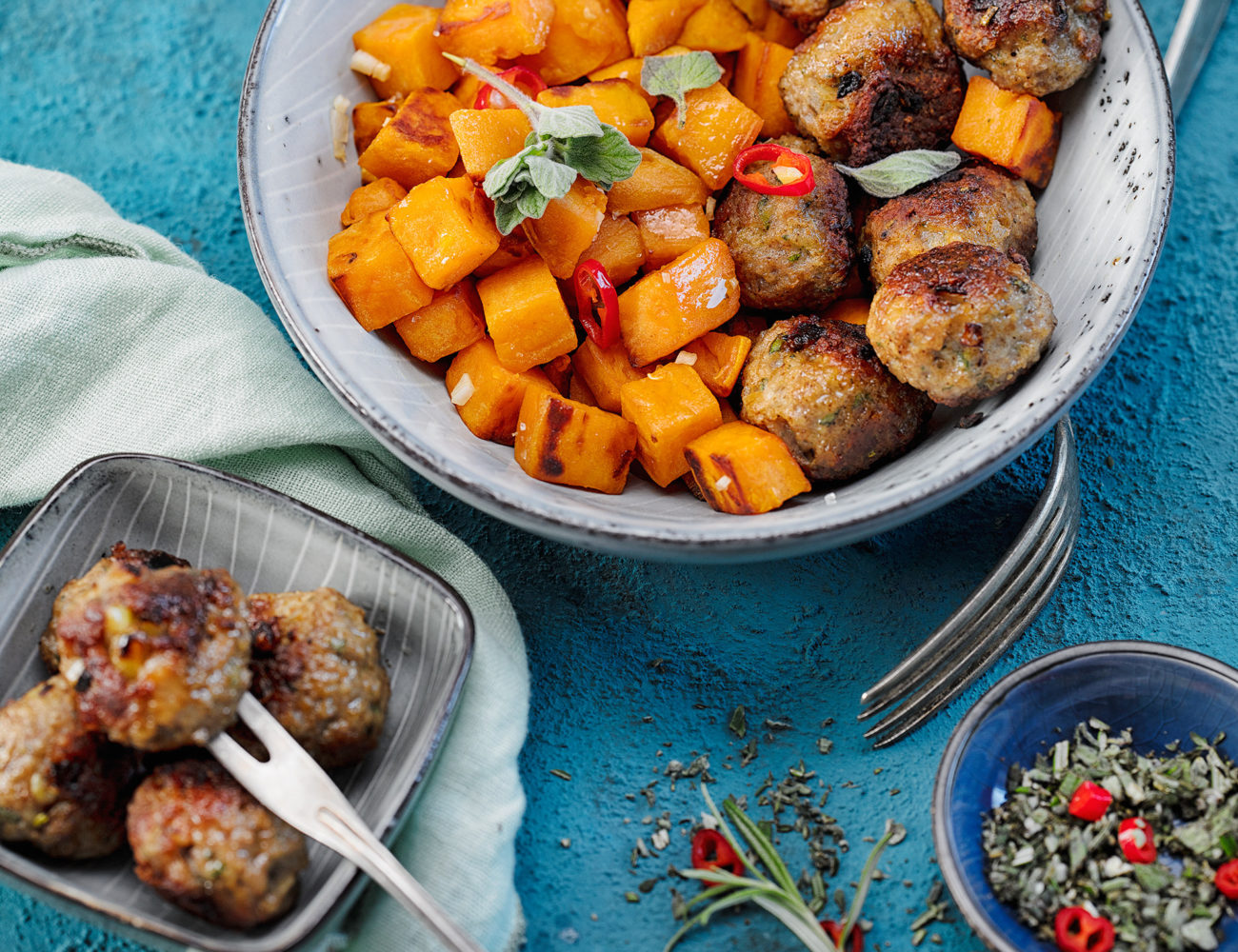 Zu den Bällchen esse ich übrigens gerne einen knackigen Karottensalat. Aber noch lieber knusprige Süßkartoffelwürfel. Die können sogar mit aufs Blech in den Ofen. Kleiner Tipp, damit sie schneller garen: Süßkartoffeln vorkochen, abtropfen lassen und mit einer Marinade vermengen. Mit auf das Blech geben und in 10 Minuten knusprig backen – yummy. Für den Mann gibt’s auch schon mal Lachsfrikadellen statt der klassischen. Aber die Hackbällchen schmecken mir eigentlich immer und in jeder Variation. Zu gegrillten Gemüsepäckchen, in einem Pitabrot mit Joghurtsoße oder in fruchtiger Tomatensoße.