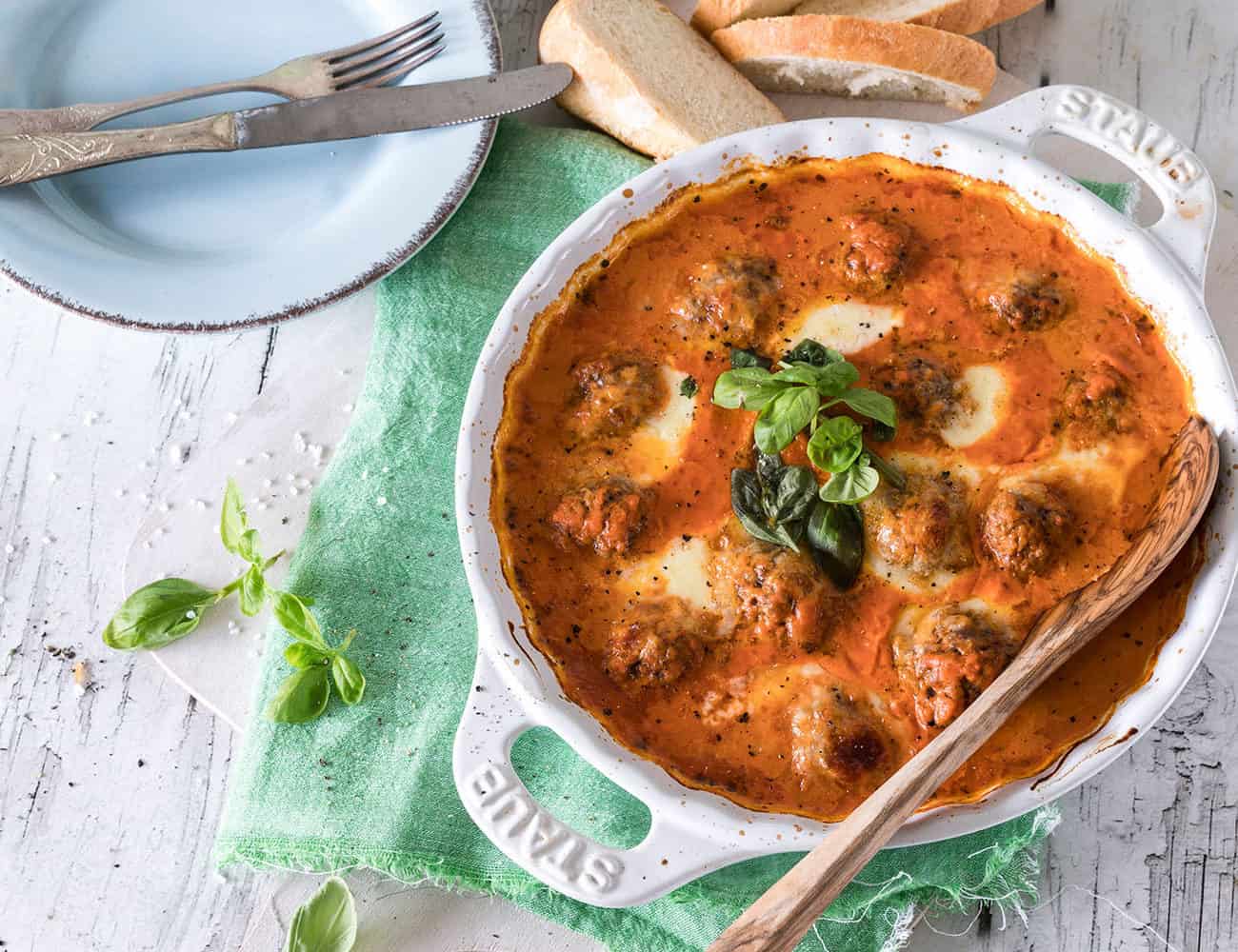 20 Minuten später ist dein Ofenglück übrigens auch schon fertig. Und das mit den saftigsten Hackbällchen überhaupt. Durch das sanfte Garen in der Tomatensoße wird garantiert nichts trocken. Ich mag das Gericht übrigens so, wie es ist. Also Low Carb ganz ohne Beilage. Wer mag, kann dazu aber auch Nudeln, Kartoffeln, Reis oder etwas Brot servieren. Einen bunten Panzaella-Salat stelle ich mir auch super dazu vor. Das kannst du also ganz nach Geschmack und Hunger entscheiden.