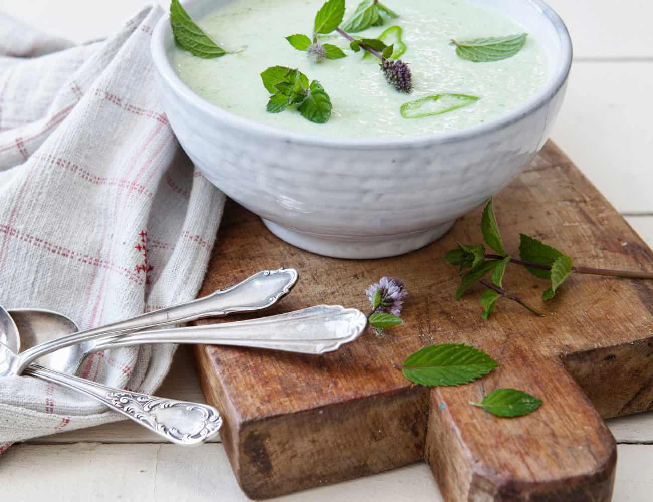 Suppe aus dem Kühlschrank nehmen, erneut mit Salz und Pfeffer würzen. Mit einem Pürierstab kurz aufschäumen, auf Teller verteilen und mit Minze garnieren. |