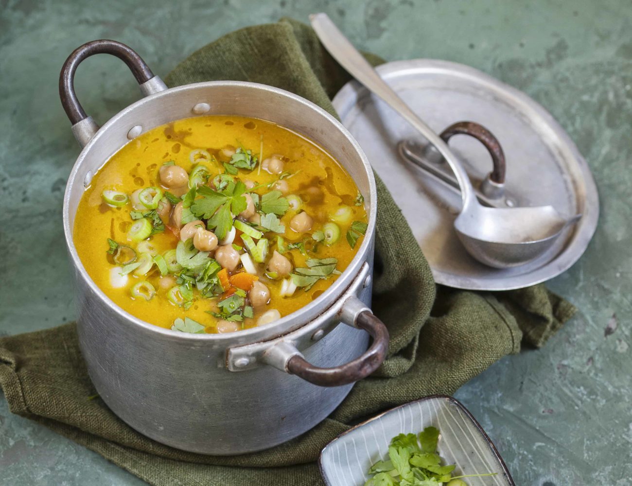 Ich habe ja eine große Schwäche für Kichererbsen. Ob als Falafel im Döner oder cremiger Hummus – die schrumpeligen Kügelchen sind mein all time favourite. Dicht gefolgt von weißen Bohnen als Sattmachersalat und Linsen in Kombination mit Blumenkohl. Aber zurück zur Suppe – hier sind die nussigen Erbsen mein persönliches Highlight. Warum? Kichererbsen sind nicht nur Alleskönner in der Küche, sie bringen auch noch hochwertige Proteine und viele Ballaststoffe mit. Abgesehen von einer Reihe anderer gesunder Eigenschaften. Das macht den cremigen Mix zur echten Sattmachersupppe. Und weil das so gut schmeckt, haben die Erbsen sogar einen doppelten Auftritt. In der Suppe und auf der Suppe.