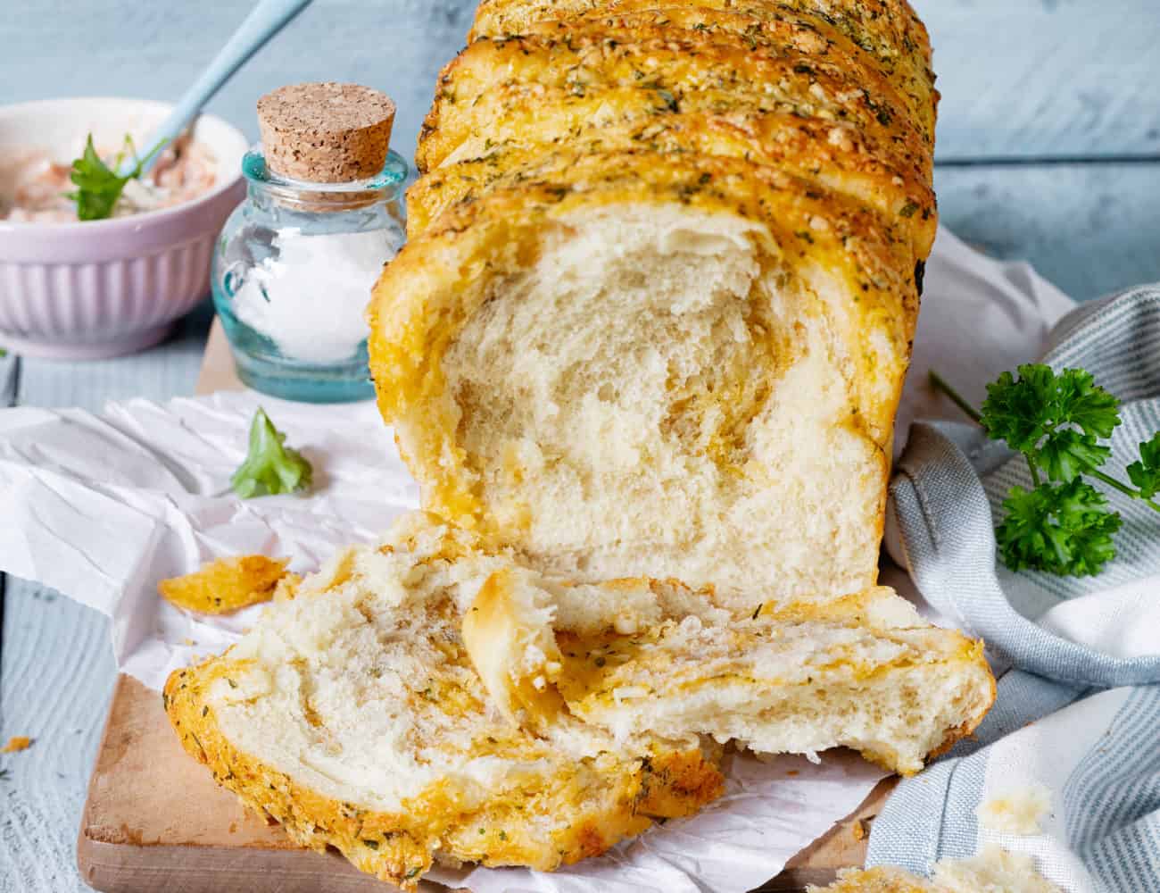 Das Besondere an dem Brot ist seine Füllung. Stück für Stück zupfst du dir ein fluffiges Scheibchen ab. Jede davon bedeckt mit Knoblauch, zwei verschiedenen Kräutern, Bergkäse und Gewürz. Kannst du dir noch etwas Besseres vorstellen, als all das in einem Brot verbacken? Ich nicht. Höchstens noch, wenn etwas Speck dabei ist. Ähnlich wie in dem Kartoffelbrot mit Speck. Möglich wär’s. Vielleicht probiere ich diese Kombination beim nächsten Mal einfach aus. Die Basis des Knoblauchbrots ist nämlich immer gleich. Ein geschmeidiger Hefeteig aus hellem Weizenmehl, den du mit deiner Füllung bestreichst.