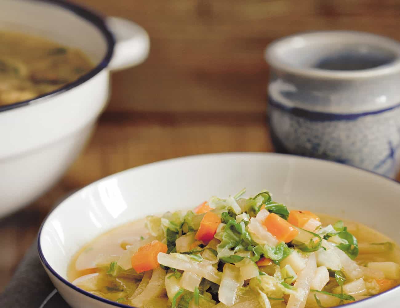 Chinakohl und die Hälfte des Grüns unter die Suppe rühren und 5 Minuten ziehen lassen. Suppe kräftig mit Salz und Pfeffer abschmecken. Vor dem Servieren die gehackte Petersilie dazugeben. |