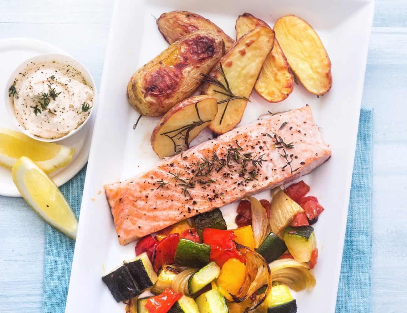 • Ofengemüse mit Lachs und Rosmarinkartoffeln