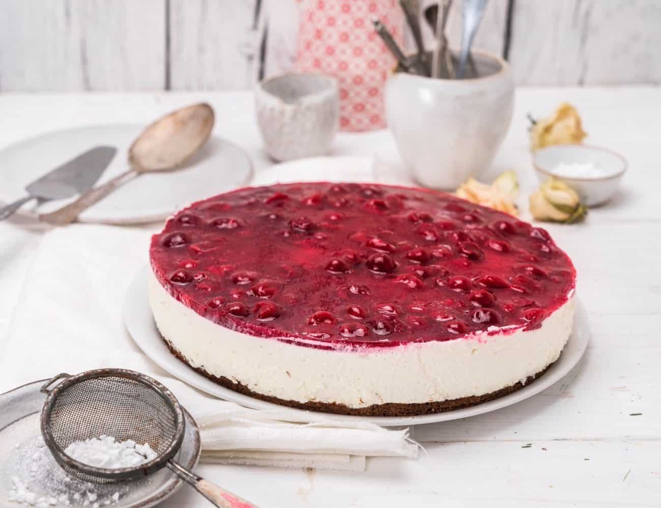 3 EL der Kirschgrütze zur Gelatine geben und unterrühren. Danach restliche Kirschgrütze ebenfalls unterrühren. Guss auf die Torte geben und gleichmäßig verteilen, mindestens 4 Stunden kaltstellen. |