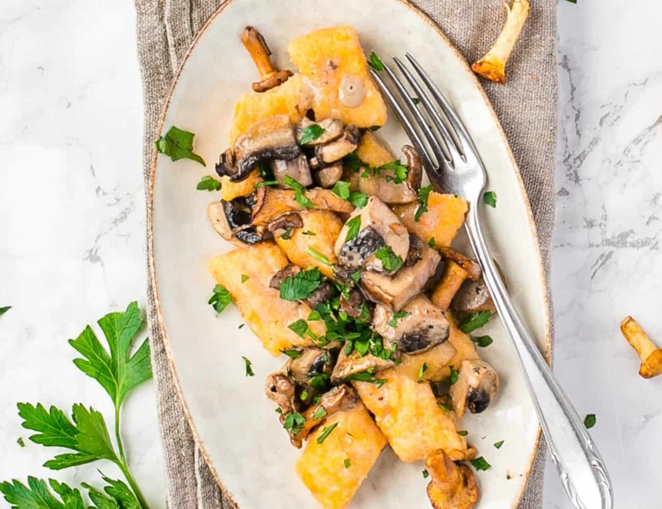 Petersilienblättchen hacken. Pilzsoße über den Gnocchi verteilen und mit Petersilie garnieren. |