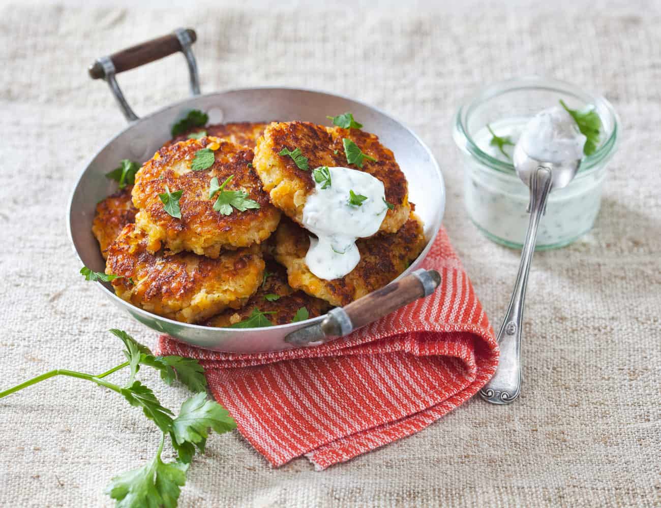 Knusprigste Süßkartoffelbratlinge mit Joghurtdip