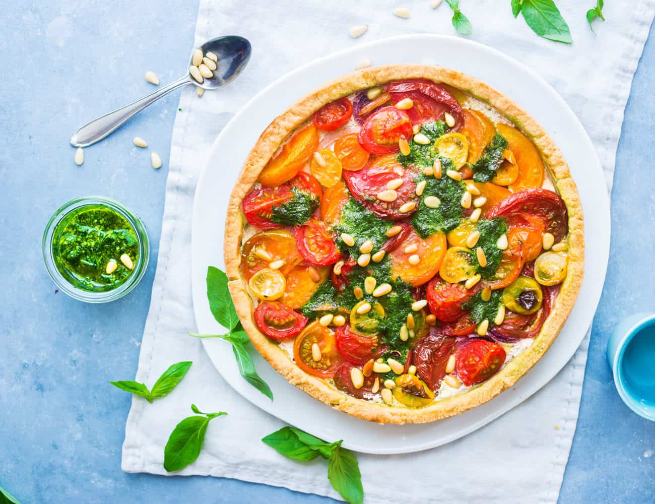 Kuchen muss nicht immer süß daherkommen. Kuchen geht auch herzhaft – mit ganz vielen Tomaten, Ricotta und Pesto. Klingt gut für dich? Für mich auch. Und schmeckt auch so. Ich spreche aus Erfahrung. Diesen Tomatenkuchen backe ich jetzt schon das fünfte Mal in Folge. Ist schließlich ganz einfach gemacht. So ähnlich wie eine Quiche. Die Basis ist nämlich ein Mürbeteig. Schön knusprig, buttrig und dank einem Ei auch extra mürbe. Theoretisch kannst du auch einen Hefeteig nehmen, so wie bei meinem Gemüsekuchen mit Parmesanstreuseln. Oder einem klassischen Zwiebelkuchen. Aber mir schmeckt der Tomatenkuchen mit Knusperboden am besten. Highlight ist übrigens der cremige Guss mit Ricotta und Pesto. Letzteres kleckse ich zum Schluss auch noch über die Tomaten – yummy!