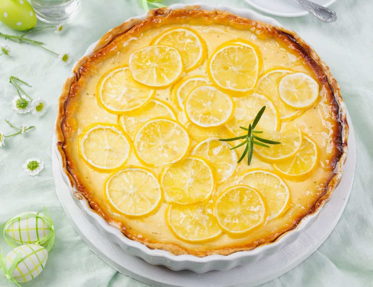 Restliche Zitronen abwaschen, trocken tupfen und in Scheiben schneiden. Guss auf vorgebackenem Boden verteilen, Zitronenscheiben darauf legen und Tarte im heißen Ofen 45–55 Minuten goldbraun backen. |